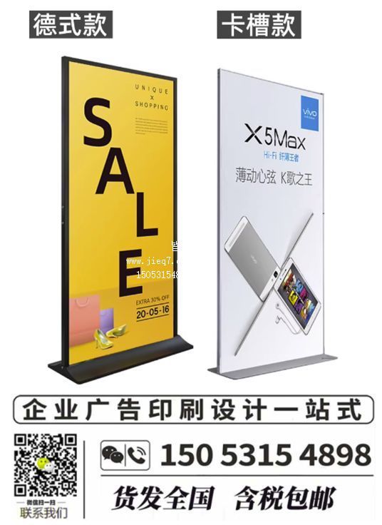 该展架可双面展示,多用于高端商场和品牌活动中。该展架全身都是纯铝合金材质,无边框设计,是目前广告界高端的展示展架之一。